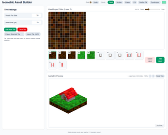 Isometric Asset Builder is a lightweight, intuitive tool designed for game developers, pixel artists, and prototypers who need isometric assets fast. Instead of spending hours in traditional art programs, you can sketch, stack, and paint voxels directly in a grid-based editor and instantly see the results in an isometric preview.